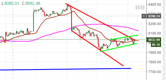 昨天早盘发文提示了即将展开回调走势,建议半仓对待。而实际走势也符合预期,迅速来了一波下跌,直接回到了我们的第一目标位8000点附近,然后开始反复震荡。